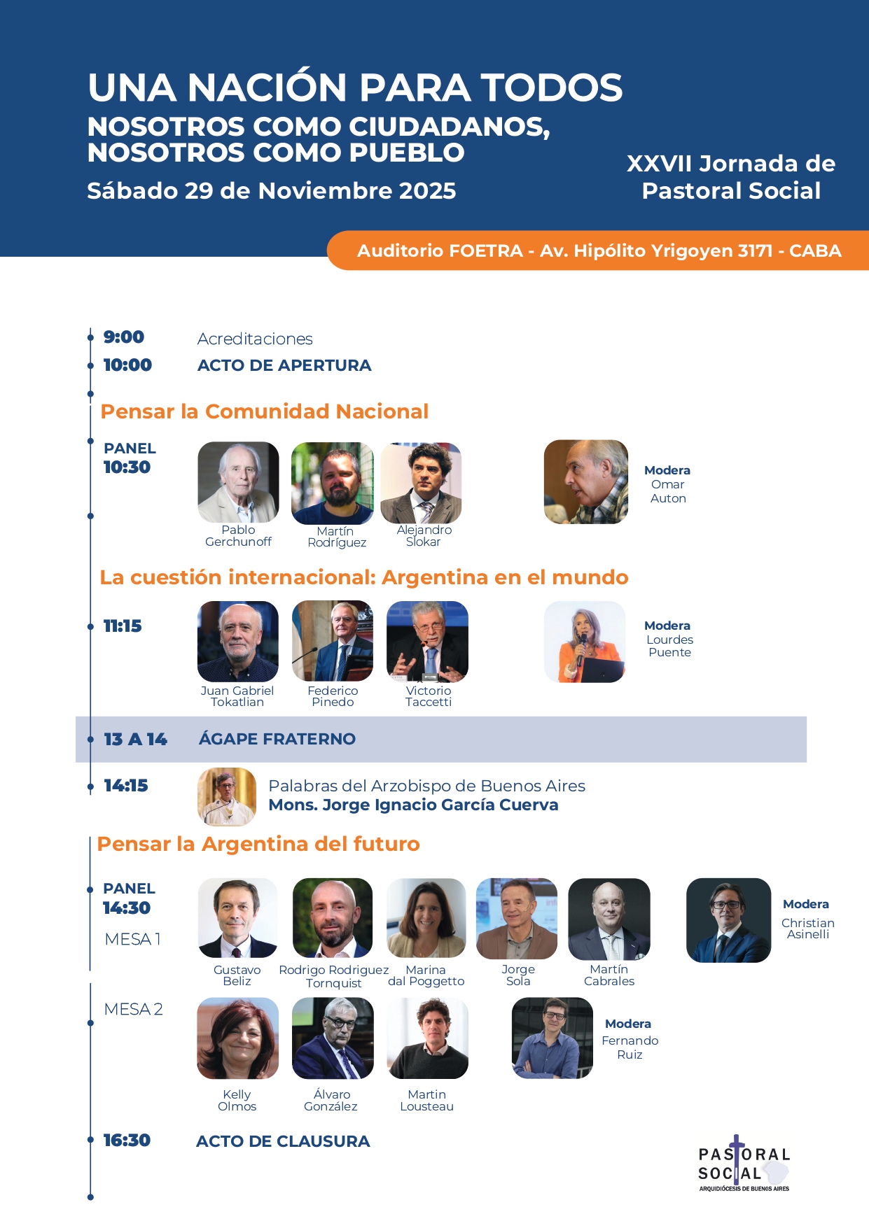 La Comisión Arquidiocesana de Pastoral Social invita a la comunidad a participar de la XXVII Jornada de Pastoral Social de Buenos Aires, que se realizará el sábado 29 de noviembre de 2025 en el auditorio de la Federación de Obreros y Empleados Telefónicos de la República Argentina (Foetra), ubicado en Av. Hipólito Yrigoyen 3171, barrio de Almagro.